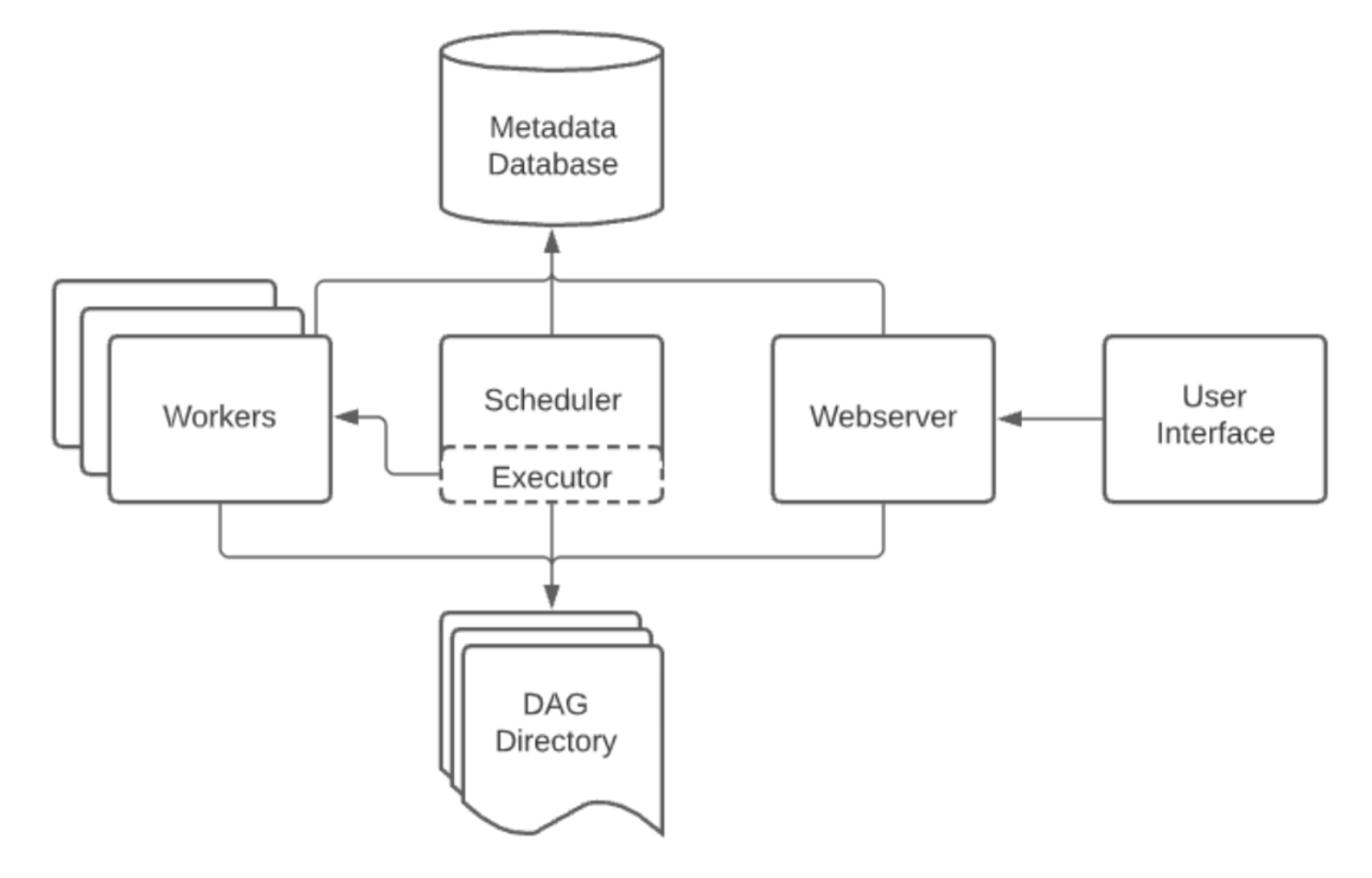 우선 Airflow는 기본적으로 scheduler, workers, metadata DB, webserver로 이루어져 있다.