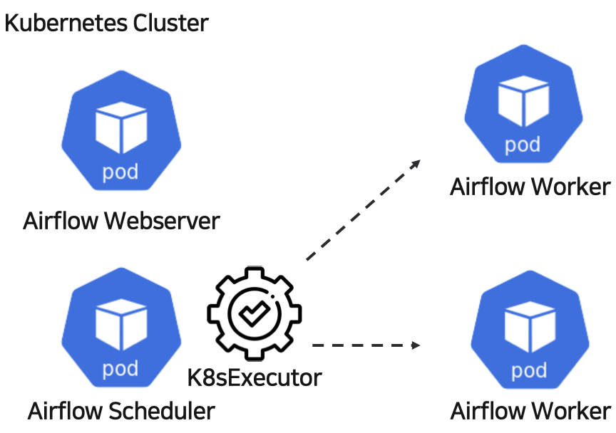 Scheduler가 task 실행 판단 후 Executor가 k8s API로 worker를 띄운 후 worker에서 task를 실행한다.